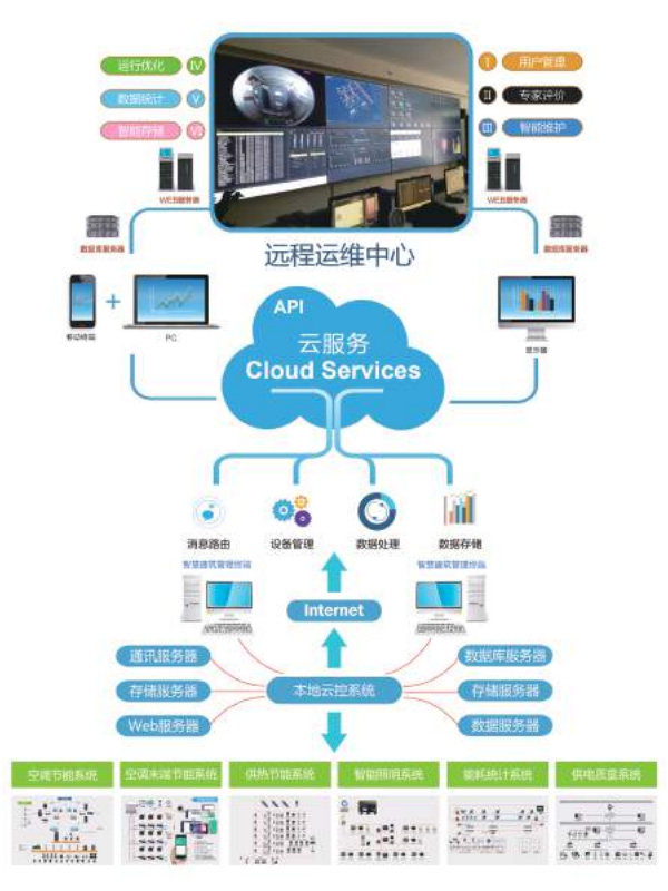智慧建筑设备物联网云平台由公用集控云管控服务端和本地云管控系统构成。公用集控云由内嵌在公用网络内的ICS/3.0系统云控管理软件构成,基于B/S平台开发,引入了云计算、大数据分析解决方案,使云数据、云控制、云存储、云管理、云节能,使智能化控制算法的智慧化程度得到了大幅度提升,实现自学习、自优化、自适应控制,并融入能源设备控制管理的每一个细节,极大的提高了综合设备监控管理的智慧程度。